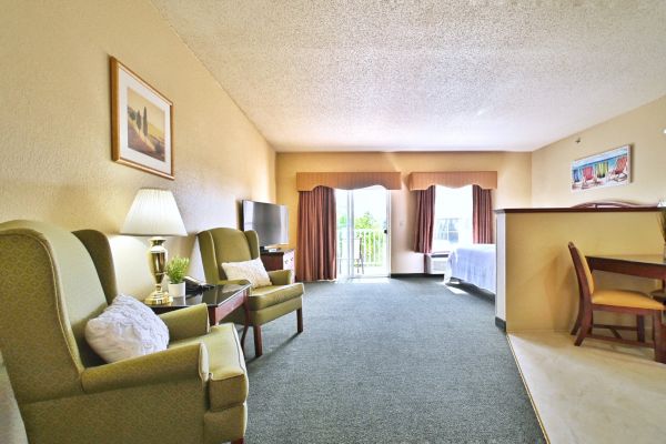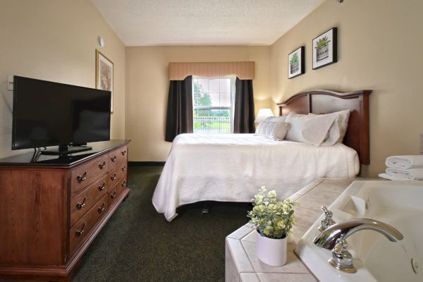 A variety of room layouts are available to fit your needs. Each room is a suite with a view of the golf course and surrounding island. Room types include double queen, two rooms suites, king suites and whirlpool suites, each with its own kitchenette. Our nightly resort fee of $25 includes access to all of our amenities plus breakfast.